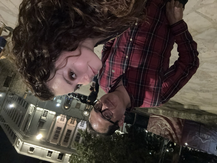 A couple poses for a selfie at night with a building illuminated in the background. The woman has curly brown hair and is positioned higher in the frame. The man wears glasses and a red plaid shirt. Their expressions are relaxed and engaging. Streetlights cast a warm glow on the scene. Other people and cars are visible in the blurred background.
