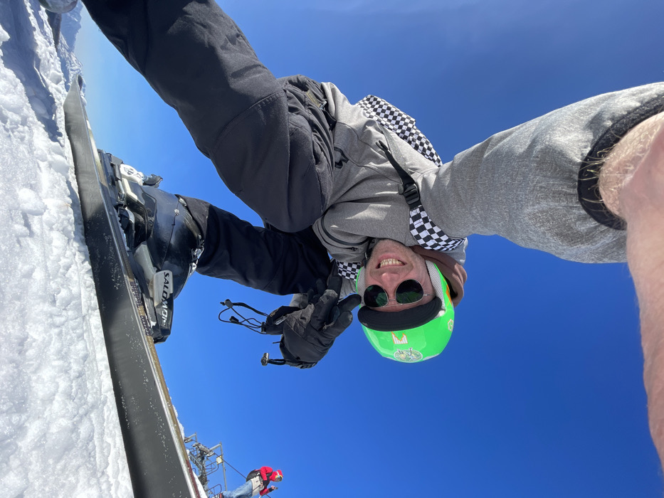 This image, captured in Katun Bačko brdo, Montenegro, presents a snowy mountain environment under a clear blue sky. The primary subject is a male individual in the foreground, positioned in a low, crouching stance, seemingly taking a selfie with the camera pointed upward. The upper portion of his arm, clothed in a grey sleeve, is visible at the top of the frame. He wears a grey hooded sweatshirt accented with a black and white checkered pattern along the shoulders and hood. A bright green ski helmet with dark reflective goggles pushed up covers his head, while dark reflective sunglasses obscure his eyes. He displays a broad, open-mouthed smile, looking directly at the camera. His attire includes black ski pants, black ski gloves, and black Salomon brand ski boots attached to skis, which are partially visible on the snow in the lower portion of the frame. His gloved right hand is positioned near his face, with two fingers extended. An earbud cord is visible dangling from his right glove. In the mid-ground, to the right, a second individual in a red jacket stands on or adjacent to a metallic structure, possibly a ski lift component, looking away from the camera. The distant background reveals snow-covered mountain peaks beneath the bright sky.