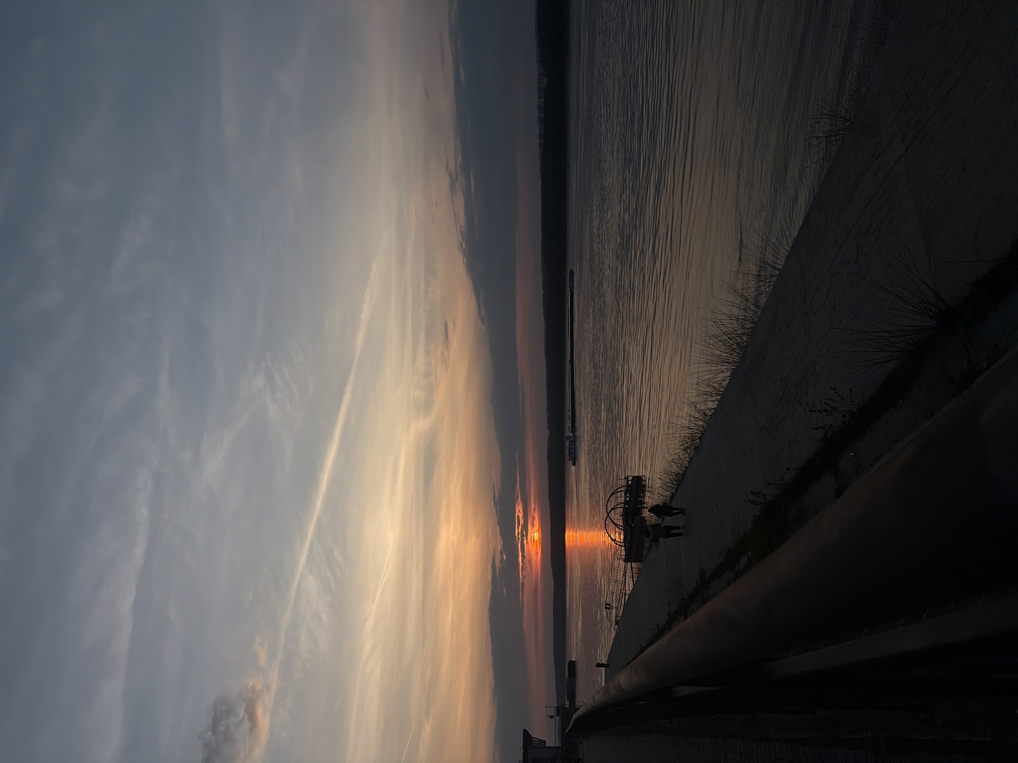 The image depicts a sunset over the Danube River in Lom, Bulgaria, viewed from the river's south embankment. The sky transitions from pale blue-grey at the top, featuring wispy cirrus clouds and multiple aircraft contrails, to a vibrant orange and yellow at the horizon where the sun is setting. Dark grey clouds partially obscure the bright, round orange sun, which casts an intense, elongated reflection across the rippled river surface. In the foreground, a dark metal railing extends diagonally from the lower-left, partially obscuring a paved walkway on the left. A large, multi-story structure, likely part of the port infrastructure, is visible on the far left of the embankment. Below the walkway, a sloping concrete bank leads to the water's edge, where sparse vegetation is visible. Two human figures, rendered in silhouette, are walking side-by-side on this concrete bank near the center-left. A smaller, third silhouette is discernible further left on the bank. A floating structure, appearing to be a small pier or pontoon, is moored near the bank in the mid-ground. It features a gangway connecting to a pontoon with two distinctive semi-circular arched metal frames. On the river, a small dark vessel is positioned near the left embankment structure, while a larger, flat-topped barge or cargo vessel is visible in the mid-distance on the right side, moving horizontally. The background consists of a dark, densely forested landmass forming the opposite bank of the river. The overall lighting suggests dusk, with the foreground elements in shadow.