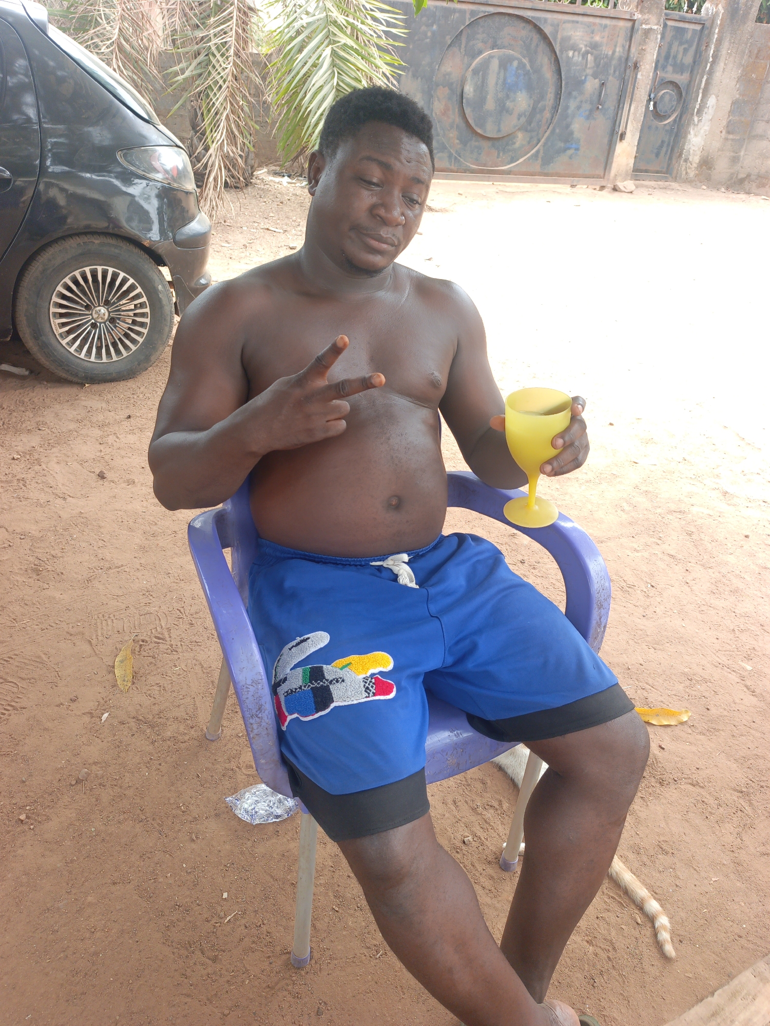 An adult male is seated outdoors on a purple plastic chair on reddish-brown dirt ground in Akwanga, Nigeria. He is shirtless, wearing blue shorts with a multicolored crocodile logo. His left hand forms a peace sign, while his right hand holds a yellow plastic goblet containing a yellow liquid. He looks toward the camera with a slight smirk. Behind him, to the left, is the rear section of a dark-colored vehicle, possibly a hatchback, with multi-spoke alloy wheels. To the right, in the background, stands a dark, possibly rusted, metal gate featuring prominent circular designs, adjacent to a light-colored concrete wall. Sparse palm fronds are visible behind the car. A silver foil wrapper and several dry leaves are on the ground near the chair. A white and light brown striped animal tail is visible on the ground behind the man's legs.