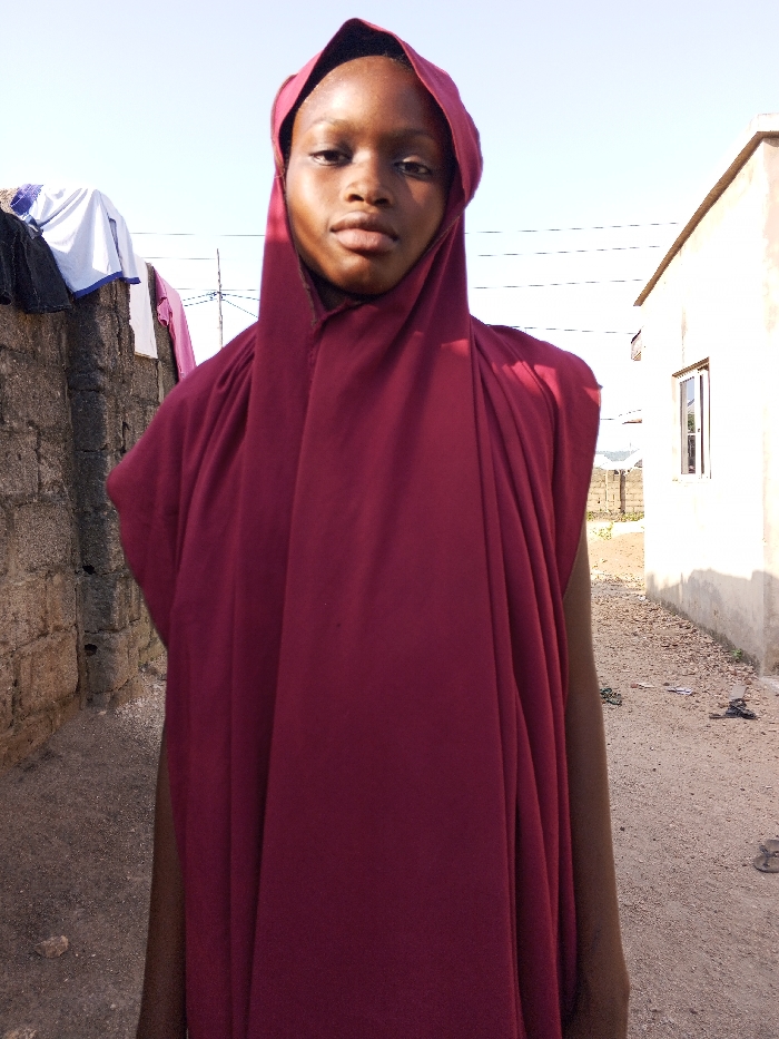 A young individual stands centrally in an unpaved alleyway in Lokoja, Nigeria, directly facing the camera. The subject, with dark skin, wears a maroon-colored, loose-fitting garment that covers their head and body. To the left, a weathered concrete block wall is visible, draped with multiple items of clothing, including a white and blue shirt and a dark garment. To the right, a light-colored, single-story building with a rectangular window is present. The ground consists of dirt and scattered debris, including a dark sandal. The sky above is clear and bright, indicating daytime conditions, with utility lines visible in the background.