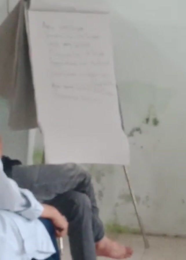 A person is reclined against a wall. They are wearing grey pants and a light blue shirt. They are holding a pen and a notebook is resting against a stick that is leaning against the wall. The notebook is open to a page with handwritten text. There is some discoloration on the wall.