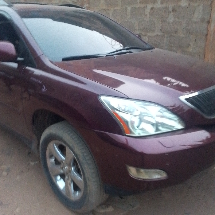 A maroon Lexus RX SUV stands outdoors, parked on a dirt surface
