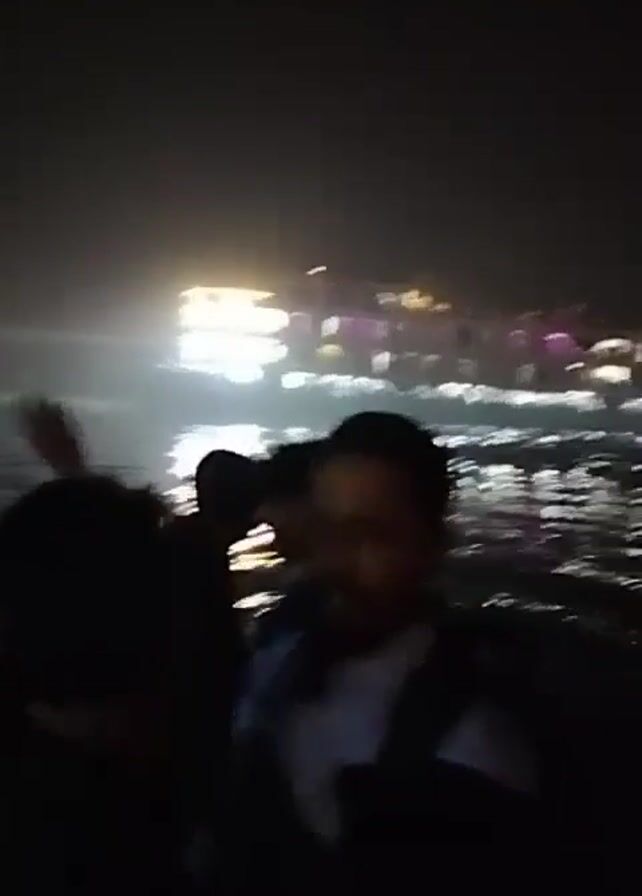 group of people on a boat at night. A building with lights is visible in the background across the water. The camera is moving slightly, and some of the people are gesturing. The water is reflecting the lights of the building.