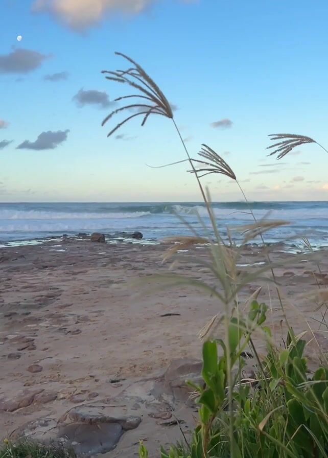 rocky beach with a view of the ocean. Tall grasses and small green plants grow in the foreground, partially obscuring the view. The sky is blue with scattered puffy clouds, and a faint moon is visible. The ocean has rolling waves with a few surfers visible riding the waves in the distance. The camera pans slowly, revealing more of the coastline and the surfers in the water. The overall atmosphere is calm and serene.