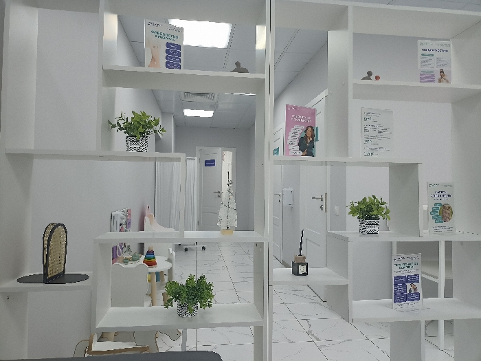 This image depicts the interior of a brightly lit, modern facility, likely a clinic or office, located in Serpukhov, Russia. The perspective is through a white, multi-tiered, open modular shelving unit serving as a room divider or display. The shelving unit, constructed of white rectangular segments, presents various items. On the upper left shelf, a vertical poster with a person's facial image and Russian text is displayed. Below it, a potted plant with green foliage rests in a black and white patterned pot. On a lower shelf to the left, a decorative object resembling a bookend with a woven cane pattern is present. Toward the center, another potted green plant in a black and white patterned pot is visible. Further right on different shelves, there are an artificial white Christmas tree with a gold base, a dark diffuser with sticks, and several informational brochures or flyers with Russian text and imagery, one featuring a woman's portrait. Through the open sections of the shelving unit, a clean, well-lit corridor or waiting area is visible. The floor is covered with light-colored tiles, possibly white with faint gray veining. White walls and multiple white doors with silver-colored handles line the corridor. Recessed rectangular fluorescent light panels illuminate the ceiling. In the left background, a children's play area is partially visible, containing a small white circular table, white chairs, and colorful toys on the floor. A white privacy screen or curtain is also partially visible on the left. No individuals are present in the scene, and no actions or interactions are depicted.