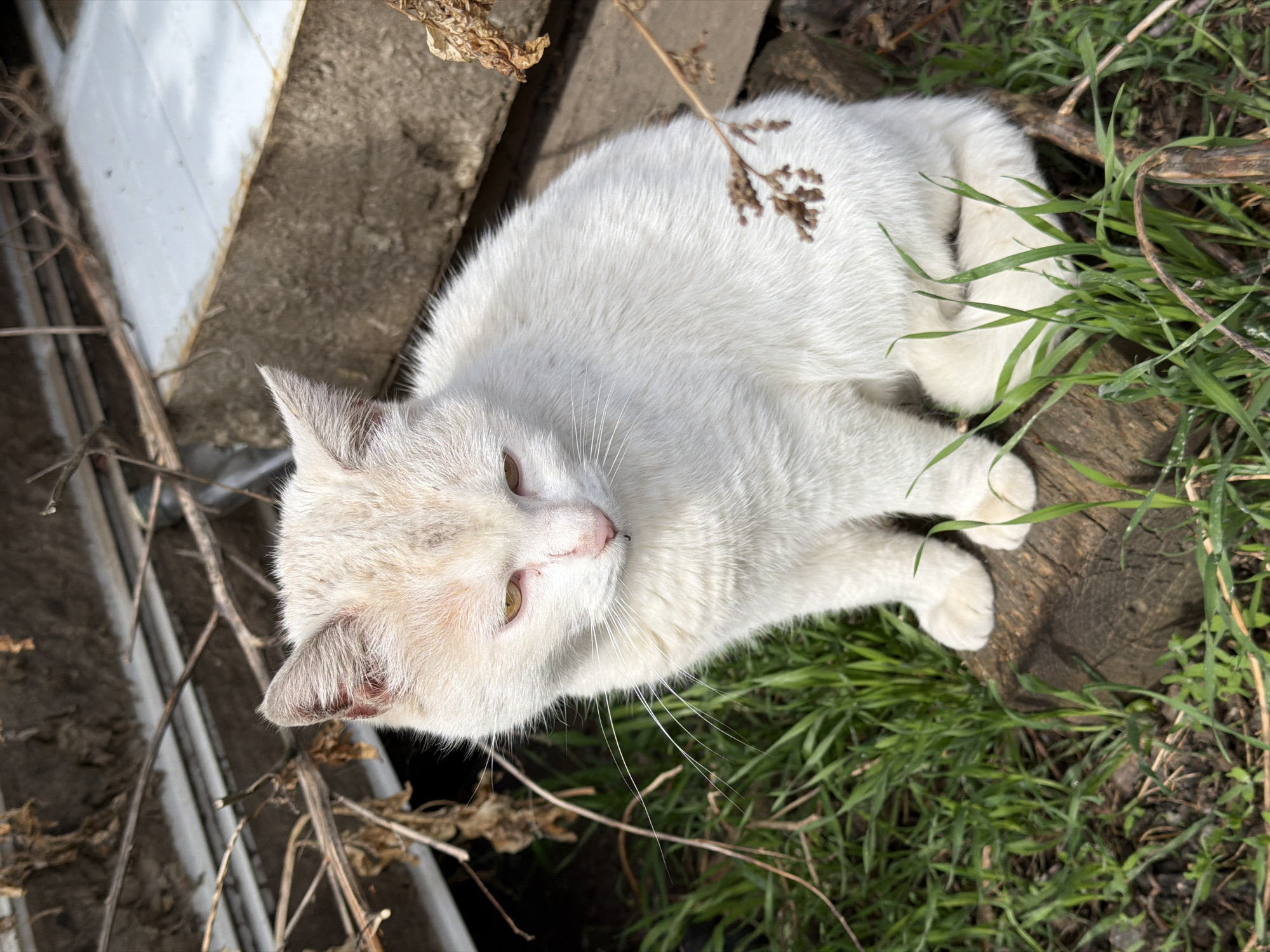 A white cat with light brown markings on its head and ears is lying on a log surrounded by green grass and weeds. The cat is positioned near a concrete structure and some weathered wooden boards. The location is likely an outdoor space in Beryozovy, Russia, based on the prompt, but this cannot be confirmed from the image alone. The cat appears relaxed and is lying on its side.