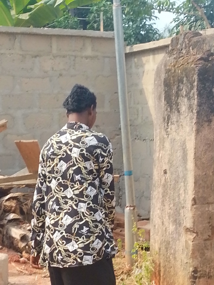 The scene, located in Enugwu-Ukwu, Nigeria, shows one individual viewed from behind, positioned slightly left of center. The person wears a long-sleeved black shirt patterned with gold and white chains, interwoven with white rectangular elements featuring a stylized "V" and "Louis Vuitton" text. Black trousers are visible below the shirt. The individual's dark, short, curly hair is styled into a distinct conical shape at the back of the head. To the right of the person, a slender, light-grey vertical pole with a blue band is present. Further right, a weathered, textured concrete or stone pillar-like structure is partially visible. The background consists of a light-colored concrete block wall, above which green foliage and a dark water tank are discernible. The unpaved ground features loose soil, sparse vegetation, and scattered wooden debris to the left of the individual. The lighting indicates daylight conditions.