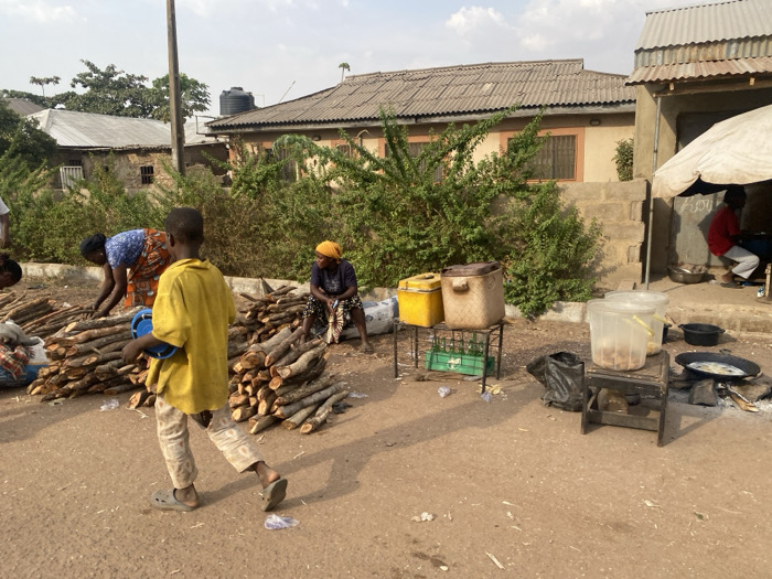 An outdoor scene shows a dirt road with stacks of firewood. A boy in a yellow shirt walks past, carrying a blue container. Two women sort through the wood. Another woman sits nearby with a yellow head covering. Behind them, a small building with green foliage. A food vendor operates under a white awning next to the building, with containers, a table, and a frying pan set up. Houses with corrugated roofs are visible in the background.