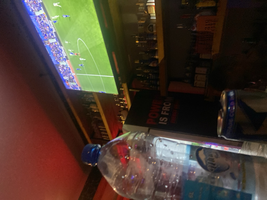 bar in Mbinga, Tanzania. A large flat screen television, mounted to the wall above a wooden bar, displays a soccer game. The game is in progress and the screen shows the field with several players in action. The word "betway" is visible twice in the background of the screen, which is likely an advertisement for a sports betting company. The bar is dimly lit with a red glow emanating from the ceiling. There is a partially filled plastic bottle of water sitting on the bar, as well as an aluminum can of beer in front of it. Behind the bar are two shelves stocked with various liquor bottles. The bar is closed for business as no patrons are present. The camera is positioned in front of the bar, facing towards the television.