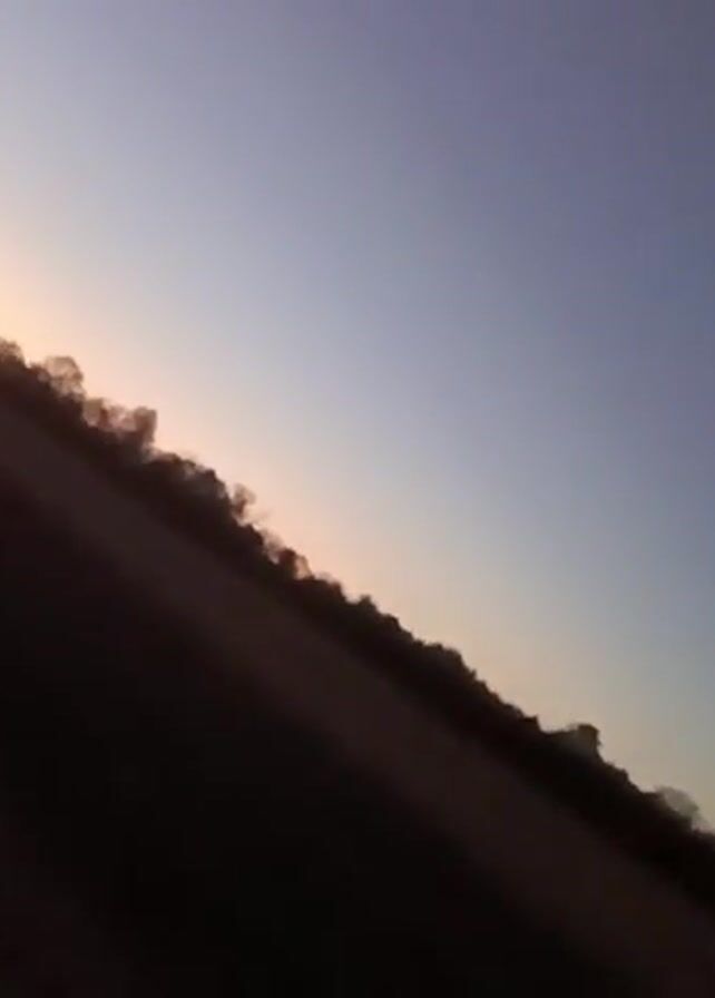 blurred view of trees and a sky transitioning from orange to blue, possibly at sunset or sunrise. The camera angle is tilted. A dark contrail is visible diagonally across the sky. Mechanical sounds are audible.