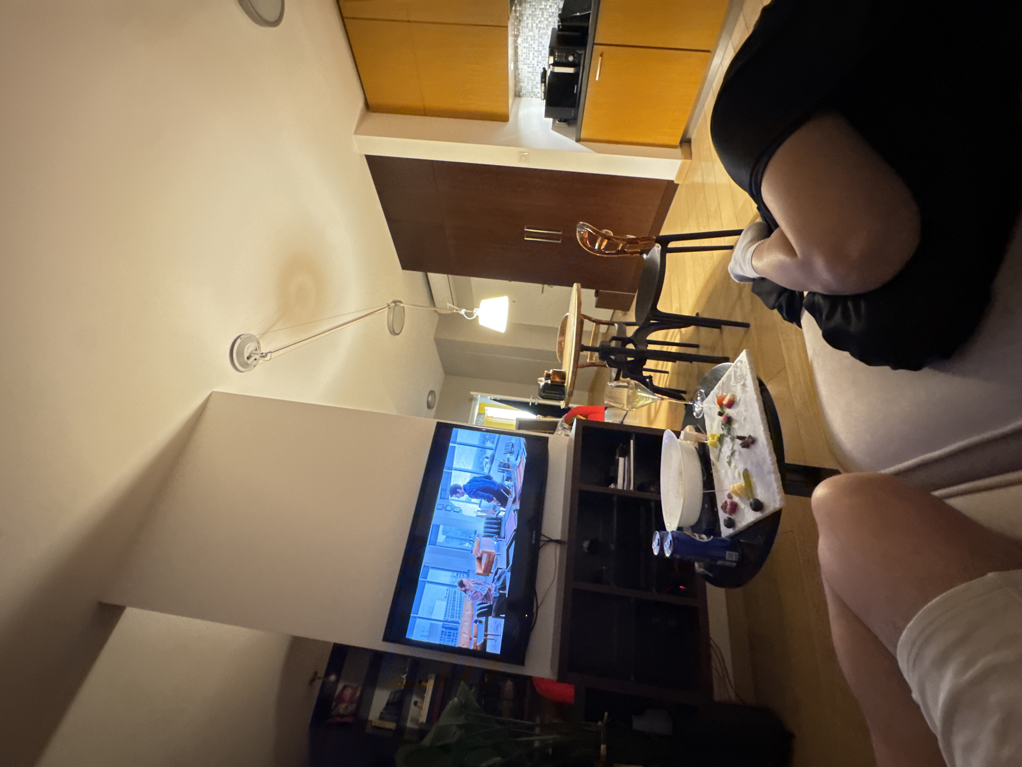 The image depicts an interior scene, likely a residential apartment, in what appears to be Warsaw, Poland, based on the architectural style and interior design elements. The focus is on a living room area where someone is watching a television. The TV is displaying a scene from a movie or show, and the viewer is seated on a sofa. A small round table is positioned next to the sofa and has a cheese plate, glasses, and other items on it. The apartment is furnished with a bookshelf and a dining table with chairs is visible in the background. The kitchen area, recognizable by the cabinets and appliances, is also partially visible. The lighting in the apartment is a mix of natural and artificial, creating a warm and inviting atmosphere.