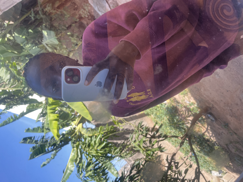 An individual with dark skin and short, dark hair is depicted in a reflection, likely a window, taking a selfie. They hold a light-colored smartphone, consistent with an iPhone model, in their right hand, capturing their reflection. The subject wears a long-sleeved maroon garment featuring a gold-colored embroidered logo on the left chest, displaying two human-like figures and the letters "R.D.A." The environment reflected and visible through the surface is an outdoor scene in Rido, Nigeria, under a clear blue sky. It features abundant green vegetation, including large banana leaves and other leafy trees, casting shadows on the reddish-brown sandy ground. A segment of a light-colored wall or concrete structure is visible in the background. A dark, circular object rests on the ground beneath a tree in the lower center-right.