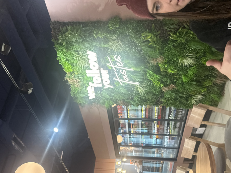 The image displays the interior of a modern food establishment, identified as a Donuterie location in Iași, Romania. The ceiling is dark blue, featuring exposed track lighting. The right side of the frame is dominated by a large vertical garden, an artificial green wall composed of various synthetic plants. Centrally mounted on this green wall is an illuminated white neon sign that reads "we follow your tastes," with the word "tastes" rendered in a distinctive cursive script. To the left of the green wall, a section of the wall is painted in a light pinkish-beige tone. Adjacent to this, multiple tall, glass-fronted commercial refrigerators are visible, filled with numerous bottled beverages arranged in horizontal rows. Below these refrigerators, a display counter with blurred items is partially seen. In the left mid-ground, a light-colored circular wooden table and two matching wooden chairs with rounded backs are positioned. In the lower right corner, a portion of a person is visible, including their right hand making a thumbs-up gesture. This individual has long dark hair, wears a dark red knit beanie, and a dark long-sleeved garment. The visible portion of their face includes their right eye and cheek.
