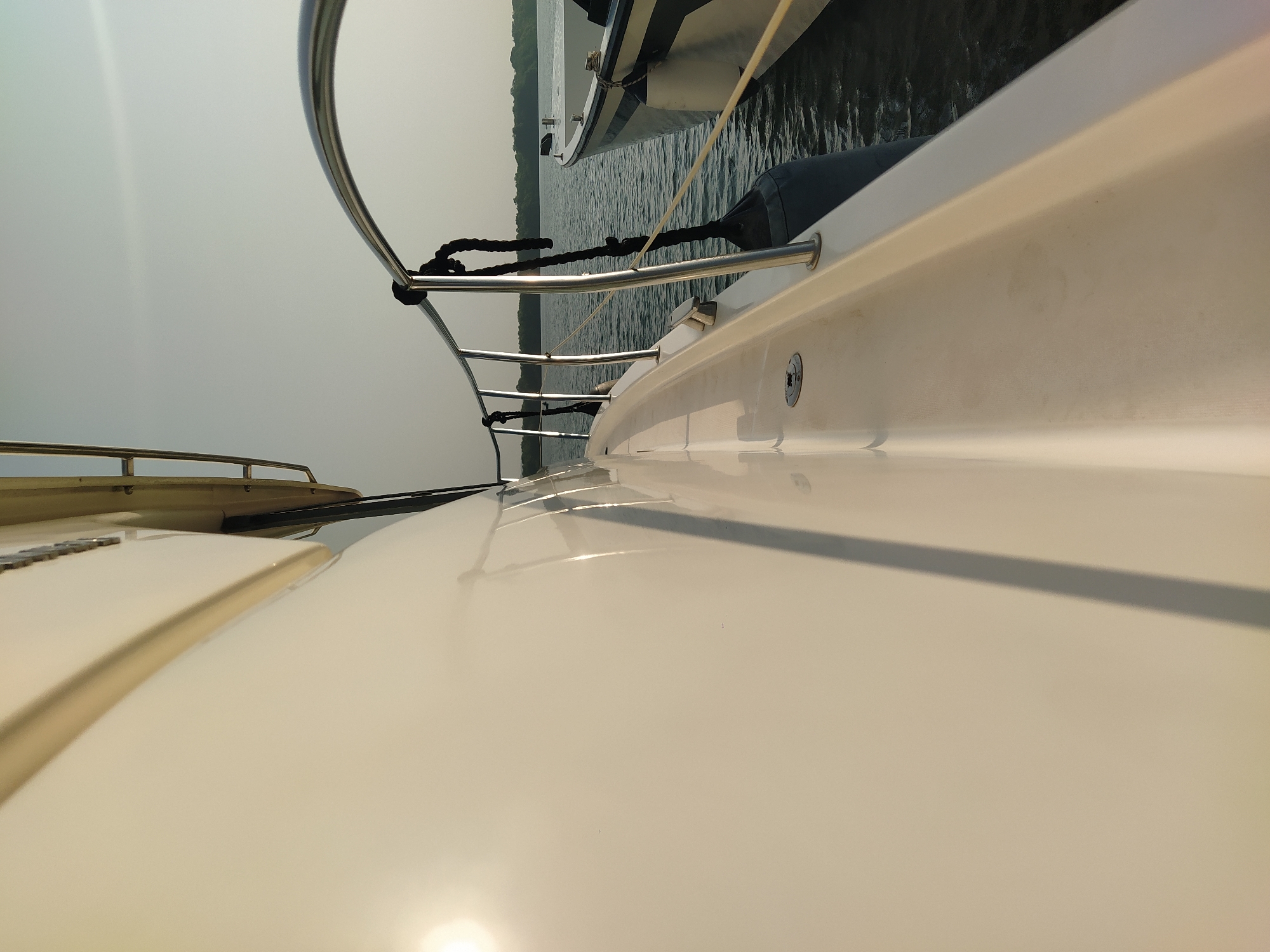 close-up, angled view from the side of a white boat, possibly a yacht or motorboat, with a metal railing