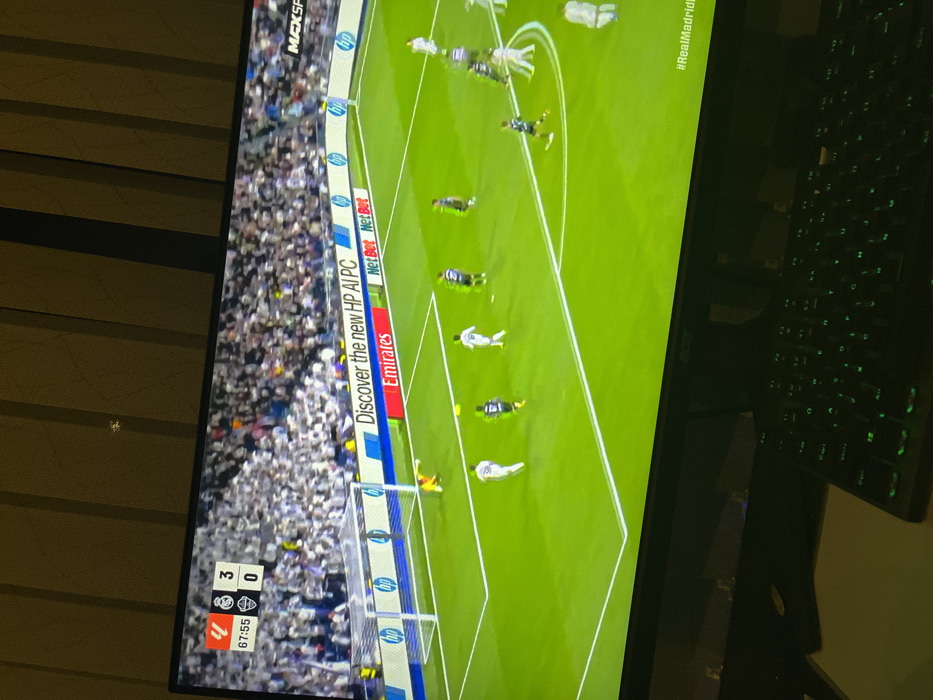 A dark room is illuminated primarily by a monitor displaying a football match. In the foreground, a black mechanical keyboard with green backlighting rests on a dark desk surface, with a corner of a white paper object partially visible to its left. The central subject is a black Acer monitor showcasing a football game at the 67:55 mark, with a score of 3-0. White-clad players, likely representing Real Madrid, are visible on a bright green pitch, with a yellow-clad goalkeeper positioned near the left goal. Digital advertising hoardings surrounding the pitch feature brands such as "HP AI PC," "Emirates," "NetBet," and "MAXSPORT." A large crowd, predominantly in white, occupies the stadium stands in the background of the screen. The upper background of the room reveals a vertically striped wall in shades of brown and beige, with a small, indistinct object near the top center. The image provides no verifiable information regarding a specific location within the city of Rakovski, Bulgaria.