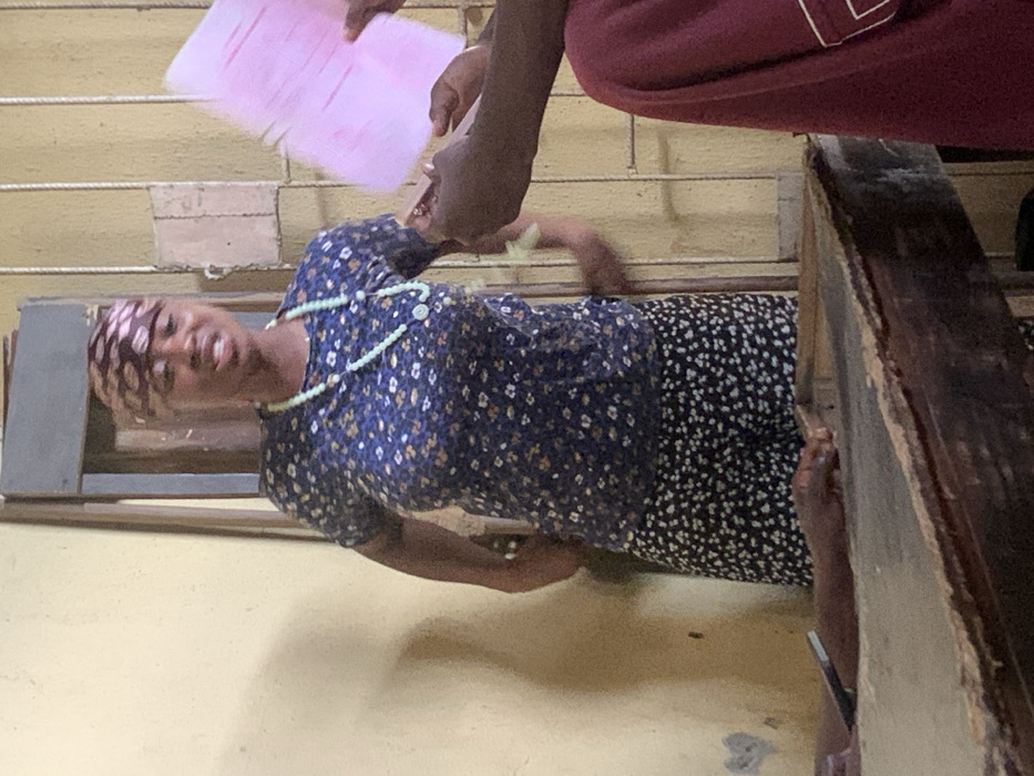 The image depicts an indoor scene in Ijegun, Nigeria, with at least three individuals present