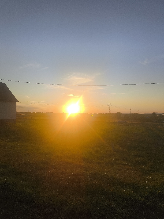 The image depicts an outdoor, rural or semi-rural scene at either sunrise or sunset, specifically in Haguenau, France. The foreground consists of a dark green, uncultivated grassy field. A brilliant, low-lying sun, characterized by intense yellow and orange hues and significant lens flare, is centered horizontally in the midground, obscuring details beyond it. To the immediate left of the frame, a partial view of a white or light-colored building with a dark-sloped roof is visible. In the background, silhouetted against the bright sun, are multiple utility poles or electricity pylons, and faint outlines of distant structures. A thin, dark utility line traverses the upper portion of the frame horizontally. The sky transitions from a clear, light blue at the top to warmer orange and yellow tones near the horizon. No individuals, animals, or explicit actions are depicted.