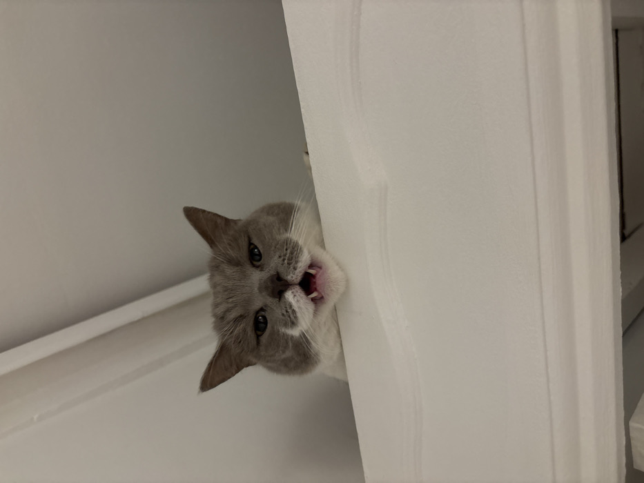 A lilac point British Shorthair cat peers down from a high vantage point. The cat's head is angled downwards, with its mouth slightly open, revealing its teeth and tongue. The cat's eyes are wide and observant. A white painted wooden frame surrounds the cat. The background includes white walls and ceiling. The scene is captured in an overhead shot with natural lighting.