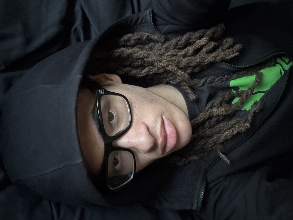 A person wearing glasses and a black hoodie lies sideways, facing the camera. The hoodie is zipped up, revealing a glimpse of a bright green graphic on a black shirt underneath. The person has dreadlocks. The background appears to be dark fabric or a bed covering. The lighting is somewhat dim, and the focus is on the person's face and hair.