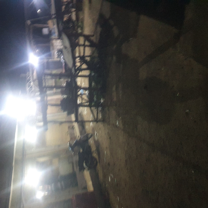 Night scene depicting a street, potentially wet, with a motorcycle parked near a building's façade. The building is illuminated by several bright lights. A structure possibly related to a building project stands out. Shadowy figures or structures are discernible against the street. The image has a grainy and dark quality overall.