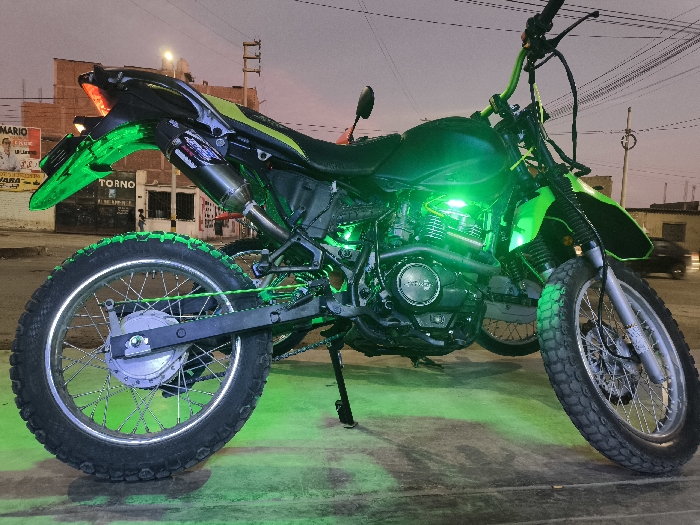 A dark-colored dual-sport motorcycle, prominently featuring extensive green LED lighting on its chassis, engine, and rear fender, is parked on a paved surface in Trujillo, Peru