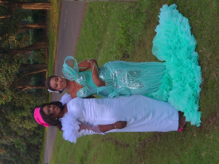 Two women are standing in a grassy area next to a paved road. The woman on the left is wearing a white dress with ruffles and a pink hat. She is looking directly at the camera. The woman on the right is wearing a turquoise dress with a large ruffle skirt and a beaded bodice. She is looking to the right of the camera. Both women are wearing jewelry. The background is a grassy area with trees lining a paved road. The coordinates provided place the location in New Hope, Tanzania. The women are standing on a small patch of grass in front of a row of trees and a road. The image appears to have been taken outdoors in the afternoon. The sky is clear. The lighting is bright and the image is well-exposed. The scene appears to be a celebration or a special occasion.