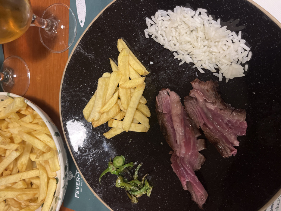 A black plate contains rice, french fries, fried green peppers, and sliced rare steak. A large bowl of french fries sits to the left. Two stemmed glasses, one containing a yellow beverage, are in the upper left. The plate's edge and a green and white tablecloth are also visible.