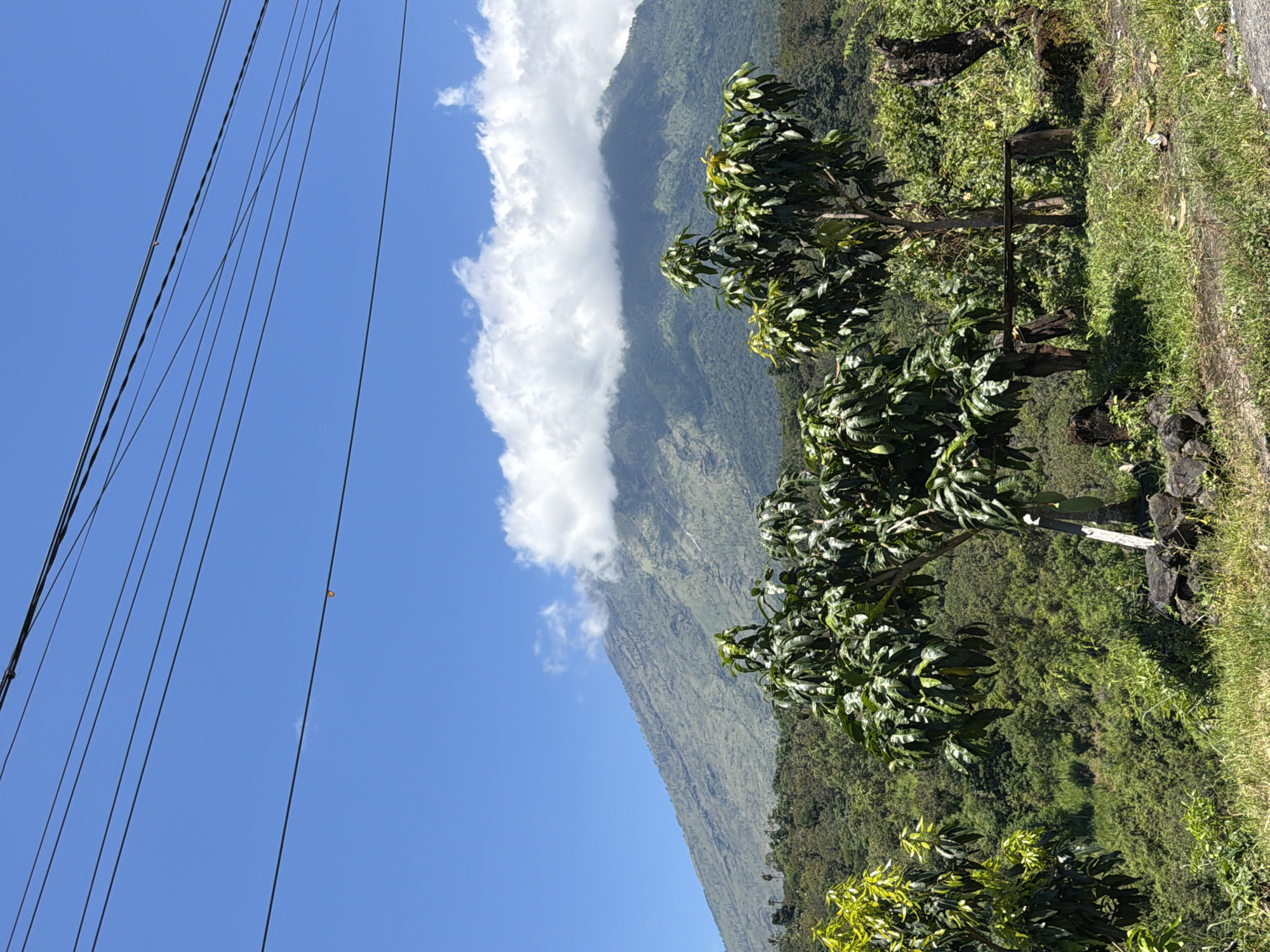 daytime view of a mountainous landscape, partially obscured by clouds. In the foreground, two young trees with green leaves are visible along a grassy embankment with interspersed rocks and short wooden posts. Lush green vegetation covers the lower slopes and valleys of the mountain. Power lines run along the left side of the frame against a clear blue sky. A small, orange spherical object is seen attached to one of the power lines. The location is Tianyar, Indonesia, based on provided information.