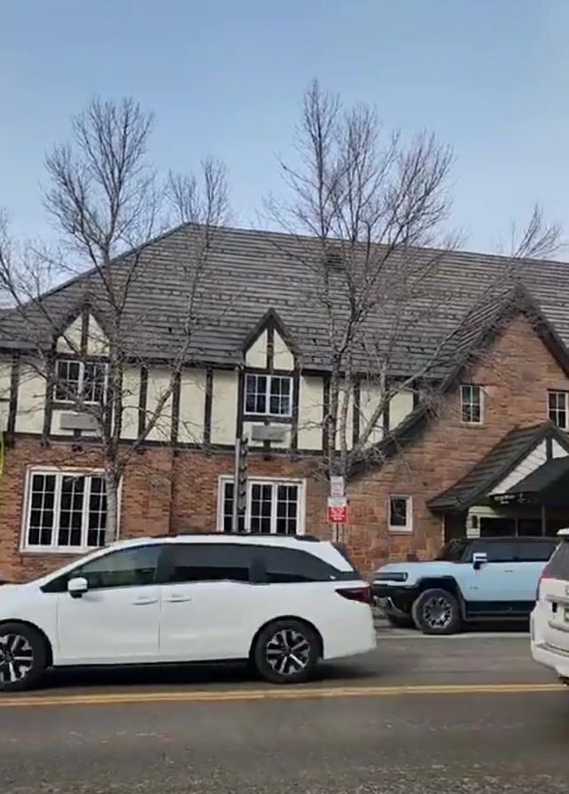 street in front of "The Gant Aspen" hotel. Cars are parked along the street in front of the hotel. The building is a large two-story Tudor-style structure with a brick facade and a dark gray tile roof. Several bare trees stand in front of the building. The sky is overcast. The video pans from right to left, showing more of the hotel and parked cars.