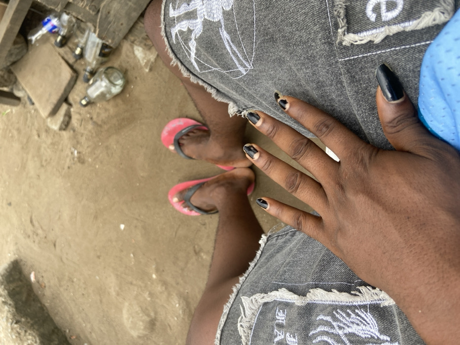 The image depicts a first-person view looking down at an individual's lap and lower extremities in Ojo, Nigeria. The subject's dark-skinned legs are visible, clad in gray denim shorts featuring frayed hems and white embroidered patterns. In the foreground, the subject's left hand is prominent, showing dark skin and fingernails painted with black polish that is significantly chipped and peeling, exposing the natural nail beneath. The thumb has a longer, pointed black nail. In the mid-ground, the subject's bare feet, also dark-skinned, are seen wearing pink flip-flops with black straps. The ground beneath the subject is light brown, appearing to be sandy or dusty soil. To the upper right, multiple empty glass bottles, at least five, are scattered on the ground near wooden planks and other debris. One bottle contains a residual blue liquid. A slight elevation of sandy earth is visible on the upper left.