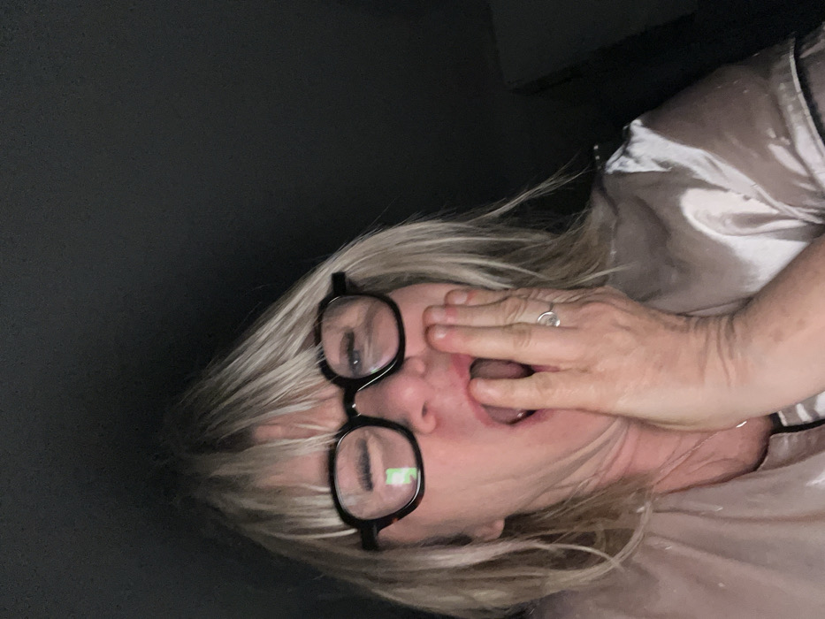 The image presents a close-up, waist-up portrait of an individual, likely female, with blonde hair, bangs, and dark, thick-rimmed glasses. The subject is captured in the act of yawning, with the mouth wide open and the right hand covering the lower face and mouth. A silver-colored ring with an open circular design is visible on the fourth finger of the right hand. The left lens of the glasses displays a distinct rectangular green reflection. The subject wears a light-colored, possibly champagne or pale pink, satin-like top with a visible dark trim. The background is uniformly dark and devoid of distinguishing features, indicating an indoor or low-light setting. The scene provides no visual information to identify the location as Cannes, France, or any specific urban environment.