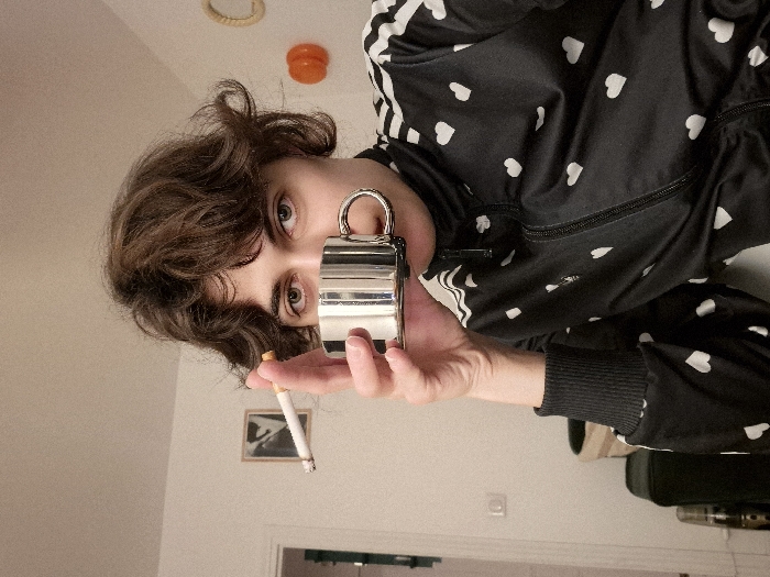 A person with short, wavy brown hair looks directly at the camera, holding a cigarette in one hand and a shiny, silver mug in the other. The mug is held up near their face. They wear a black track jacket with small white hearts scattered across it and white stripes down the sleeves. A framed picture hangs on the white wall behind them, and a door is visible at the bottom. A ring-shaped light fixture and a bright orange object are affixed to the ceiling.
