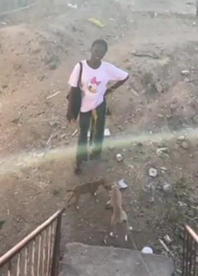 A young woman with a black tote bag over her shoulder stands above two puppies that are play fighting on a concrete platform. She is wearing a white t-shirt with a cartoon character and dark patterned pants. The puppies, one brown and one tan, are leashed and playful. The view is from below, looking up the stairs with a rusted metal railing. The surrounding ground is dirt and debris. The scene is outdoors, with a hazy sky.