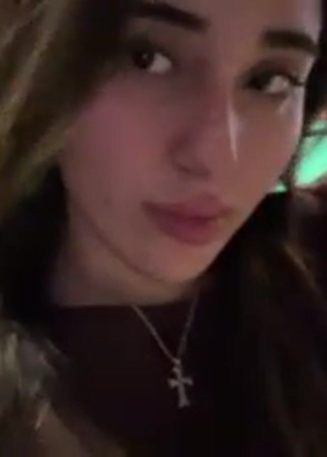 A young woman stands in front of a pool table in what appears to be a recreation room. She is wearing a brown sweater with a cross necklace. She poses for the camera, turning her head and making a kissing face. In the background, a pool table with pool balls, a pool cue, a black leather couch, and a television can be seen. The lighting is warm. The camera angle is slightly tilted. Music is playing in the background.