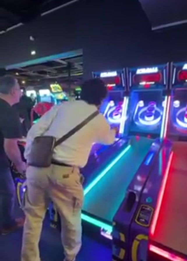 person with curly hair and a white sweatshirt playing a blue-lit Skee-Ball machine in an arcade. The person is wearing beige pants and a dark cross-body bag. An older man stands to the left, watching the person play. The arcade has multiple Skee-Ball machines, some with blue and some with red lighting. The background shows other people and arcade games. The person rolls the ball up the ramp, and the machine lights up.