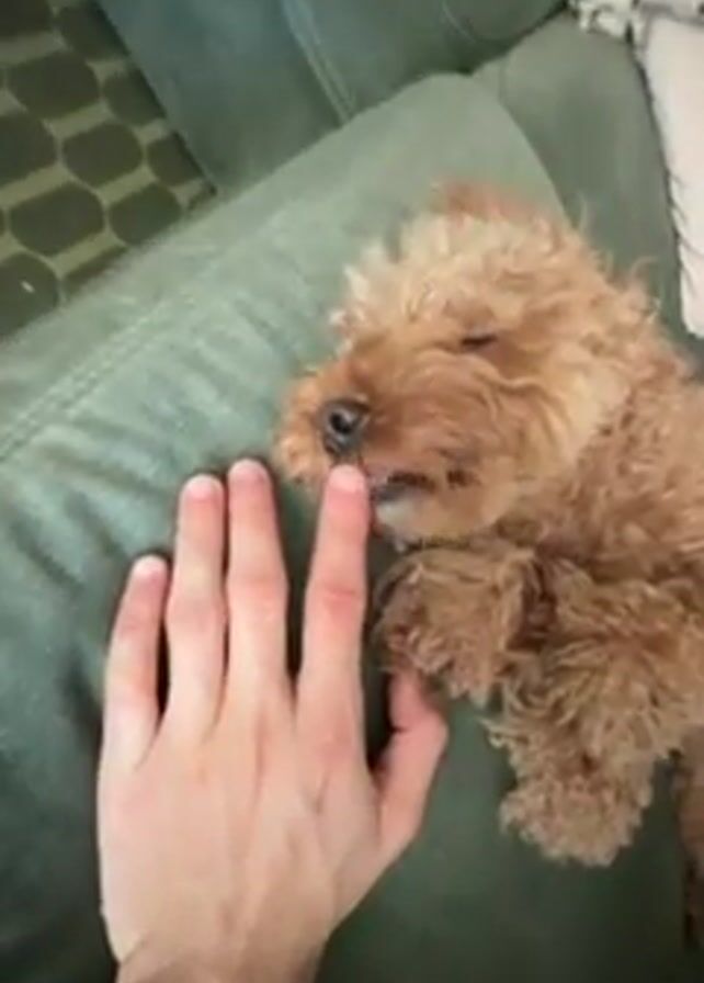 A close-up overhead shot shows a light-skinned human hand with moderately long fingers lying palm-up on a green fabric surface, most likely a couch or cushion. The hand is interacting with a small, fluffy, light-brown poodle. Initially, the dog is lying down with its head near the hand, gently licking one of the fingers. The dog's tongue is visible. The hand then moves to pet the dog's belly. The background includes the rest of the green couch and a pillow with black and white spots.