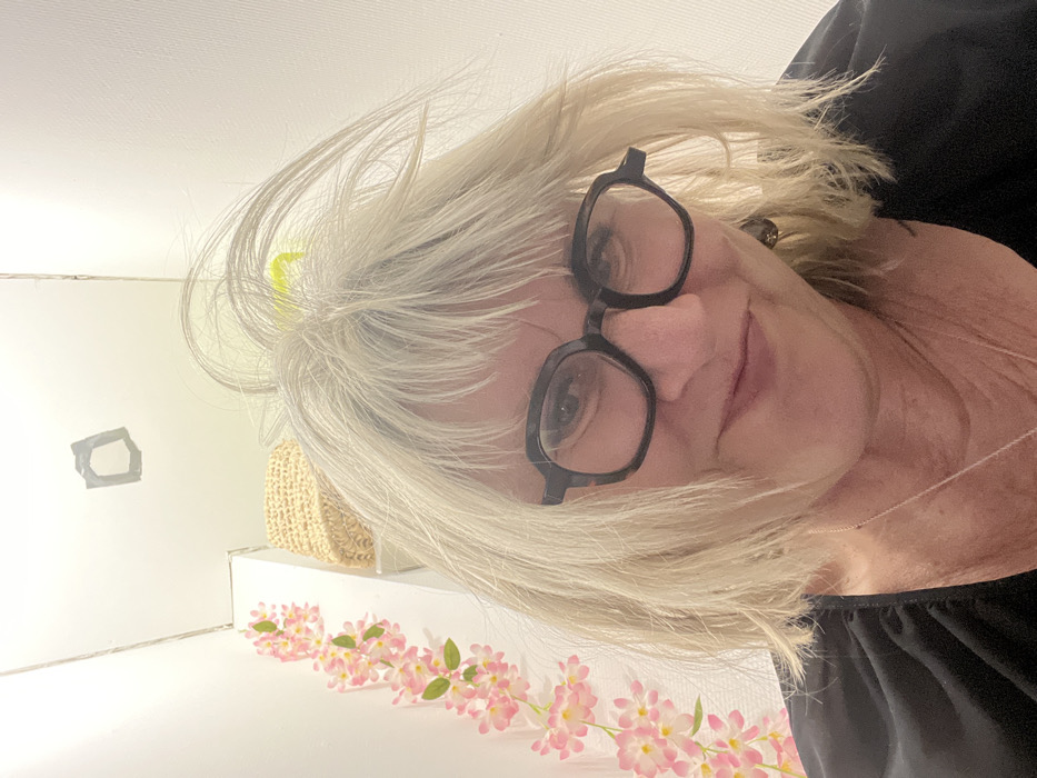 This image depicts a close-up, indoor portrait of a middle-aged to senior female subject, located in Montélimar, France. The subject's head and upper chest are visible. She has light blonde to grey hair styled in a messy bob with bangs; a distinct tuft of hair rises from the crown of her head, containing a small, bright yellow object, possibly a hair tie. She wears dark, thick-framed glasses with a hexagonal shape. Her facial expression displays a subtle, closed-lip smile. She is wearing a black garment, likely a blouse or top, with visible gathering near the neckline. A thin silver-colored chain necklace is present on her neck, and a dark earring is partially visible on her right side. The background consists of plain white walls. On the left wall, a vertical string of pink artificial flowers with green leaves is affixed. Behind the subject's head, towards the upper right, a light-colored, woven basket is partially visible. The white ceiling above shows a dark, irregularly shaped object, possibly a piece of tape or a small fixture. The lighting is even and bright, suggesting an indoor setting within a confined space, such as a hallway or corner.