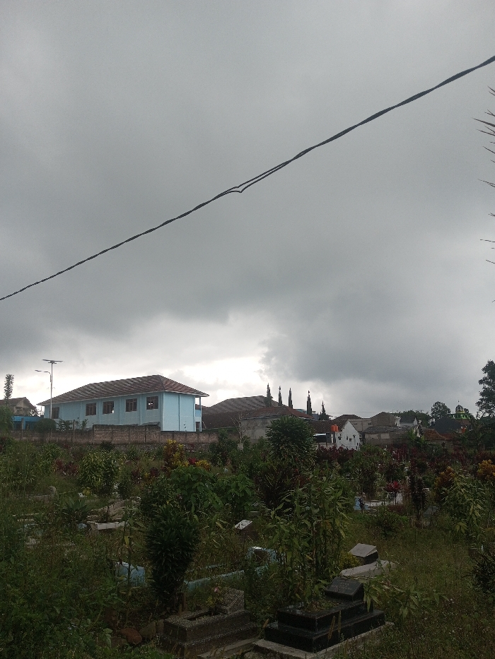 A cloudy sky hangs over a scene containing a graveyard in the foreground. Overgrown grass and various plants surround multiple tombstones. In the background, a light blue building stands on a slight rise, accompanied by other buildings and structures. A few sharp spires are visible as well. A telephone wire stretches across the top of the image, nearly cutting the frame in half.