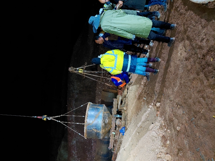 At night, a group observes a large, metal bucket suspended by cables over a deep, dirt-walled excavation. People on the upper edge wear jackets, with one in a high-visibility yellow. A worker in blue bends towards the pit's edge. The bucket is positioned above some piping and what appear to be support beams. The scene is dark, with artificial light illuminating the work area and the faces of those watching.