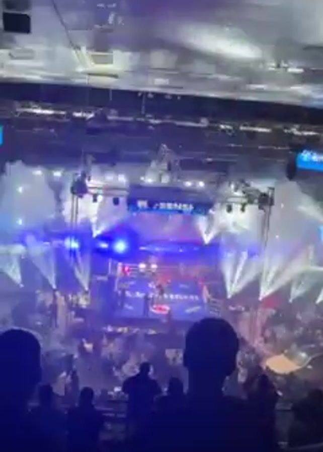 A video shows a crowded arena during what appears to be a boxing or wrestling event