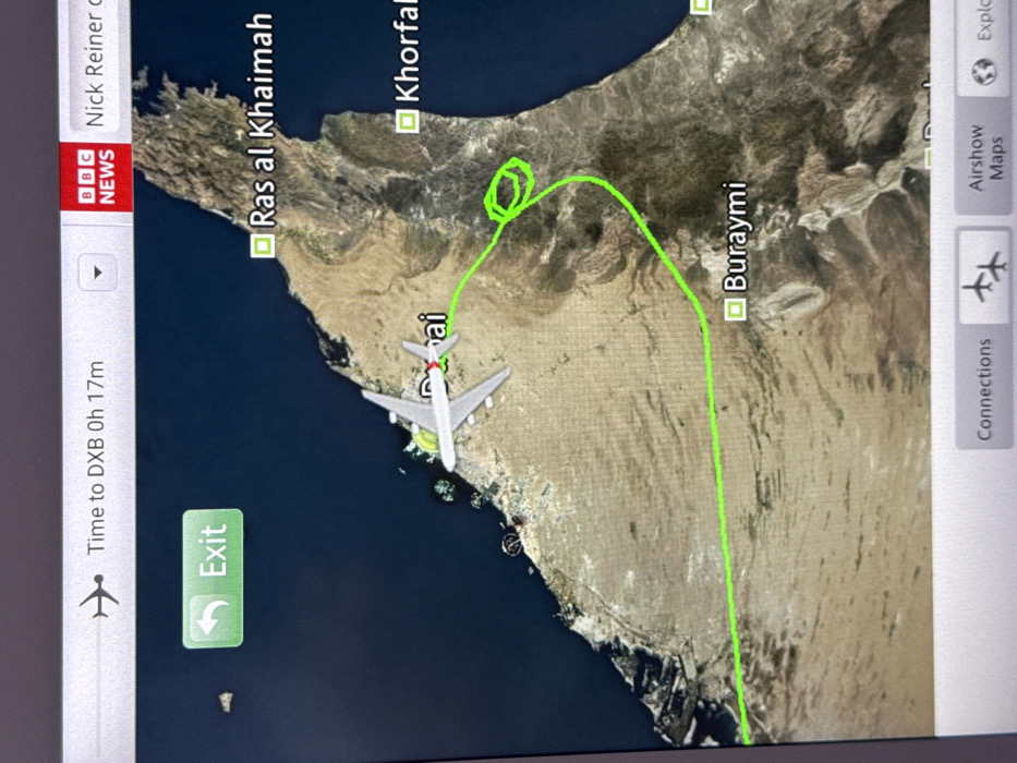 A screen displays an airplane's flight path on a map. The plane, located near Dubai (labeled "Dai"), has a green-traced route indicating a loop towards Khorfakan and then a straight path towards Buraymi. Other labeled locations include Ras al Khaimah. The screen also displays "Time to DXB 0h 17m" (estimated time to Dubai is 17 minutes). The BBC News logo and "Nick Reiner c" are visible. Interface buttons for "Exit," "Connections," "Airshow Maps," and "Explore" are also displayed.