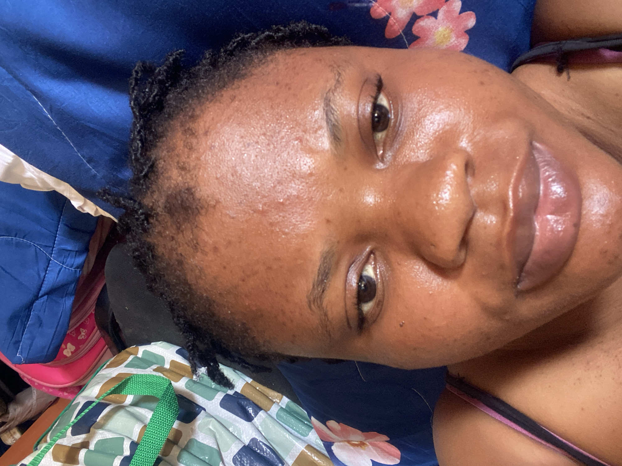 The image displays a close-up, head-on selfie of a female individual with dark brown skin. Her hair is dark, short, and styled in small twists or knots, with a visible receding hairline on the forehead. Her face appears shiny, and several small bumps are present on her forehead and cheeks. She has dark brown eyes, a broad nose, and full, glossy lips. A dark-colored strap with a pink/purple stripe is visible on her left shoulder, indicating the presence of a garment such as a tank top. The background, partially out of focus, reveals various items: a blue quilted comforter, a dark blue fabric with pink floral patterns, a pink item adorned with white butterfly motifs, and a multi-colored reusable bag featuring green, brown, and white geometric patterns with a bright green strap. The scene is situated indoors in Narayi, Nigeria.