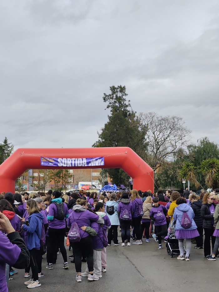 A large crowd of individuals, primarily women, is gathered outdoors beneath a prominent red inflatable arch. The arch spans an asphalt surface and features a white banner with the purple text "SORTIDA" (START) and smaller graphics including "8M" and "Marxa Feminista". The majority of participants are wearing purple garments, such as hoodies and t-shirts, and many are carrying purple drawstring bags, some bearing slogans like "Basta Feminista!". The crowd appears to be awaiting the commencement of an event, likely a march or race. In the background to the left, a multi-story building is visible, alongside what appears to be a parking area. To the right, various trees, including a tall conifer and bare deciduous trees, are present. The sky is overcast with dense grey clouds. The ground surface appears damp. This scene is located in Ripollet, Spain.