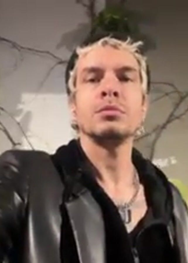 A person with bleached blonde hair and a dark beanie is holding a camera and filming a selfie video. They are wearing a black leather jacket and a silver chain. Behind the person is a white wall with a climbing vine. To the left of the person, there is a tall, thin cactus. To the right of the person, there is a prickly pear cactus. The person's expression is serious.