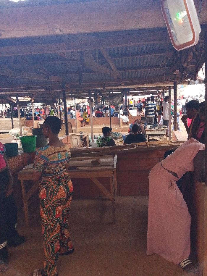 The image displays an active indoor market located in Alor, Nigeria