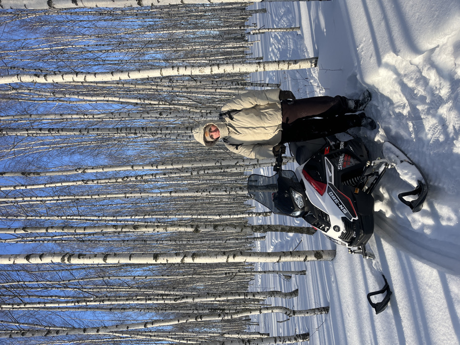 The image depicts a winter scene within a dense birch forest, identified as being in or near Новочувашский, Russia. A single individual stands to the right of a white and red snowmobile, which bears the markings "SN-380" and "SHARK MAX." The person is dressed in a light-colored hooded puffer jacket, dark trousers, and dark gloves, with a portion of their face obscured by the hood and a patterned neck covering. Their left hand is resting on the snowmobile's handlebars. The snowmobile is partially embedded in a thick layer of pristine white snow, which covers the entire ground surface. A clear, light blue sky is visible above the bare, slender white-barked birch trees that dominate the background. Bright sunlight creates distinct shadows on the snow.