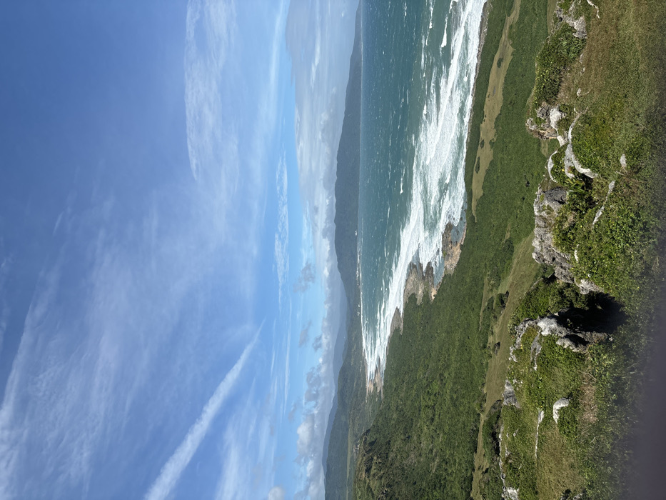 The image presents an elevated panoramic coastal view within the city of Hengchun, Taiwan. The upper portion of the frame is dominated by a light blue sky with scattered white cirrus and cumulus clouds, including a prominent linear white contrail in the upper-left quadrant. The central and right-hand areas feature a vast expanse of ocean, displaying colors ranging from turquoise near the shore to deeper blue further out. Significant whitecaps and numerous breaking waves are visible along the entire visible coastline, indicating turbulent water conditions. The coastline consists of a rugged, irregular strip of dark, rocky formations at the water's edge, which transitions immediately into dense, uniform green vegetation, primarily low-lying scrub and bushes. This vegetation covers the coastal plain and ascends into undulating green hills and mountains that recede into the distance along the left and central-background. Several distant white structures, consistent with buildings, are discernible along the far right coastline, suggesting a remote settlement or resort. The immediate foreground is comprised of rough, light-grey rock outcrops interspersed with patches of green grass and small, dense green plants, suggesting the photograph was taken from a rocky cliff or elevated vantage point. No individuals or active subjects are present.
