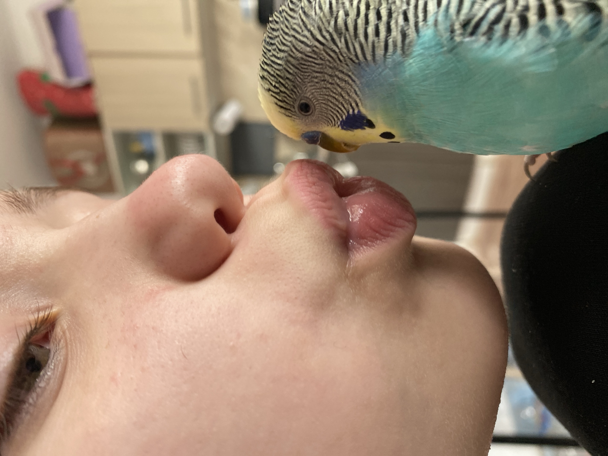A close-up image shows a person with fair skin, lying on their back, with their face tilted upwards towards a light blue and white budgerigar bird. The bird's beak is close to the person's lips, appearing as if it is pecking or preening them. The person's eye is partially visible, and the focus is on their face and the bird. The background is blurred but appears to be an indoor setting. There is a black object slightly out of focus on the right side of the image, possibly clothing. The image does not specify a location.