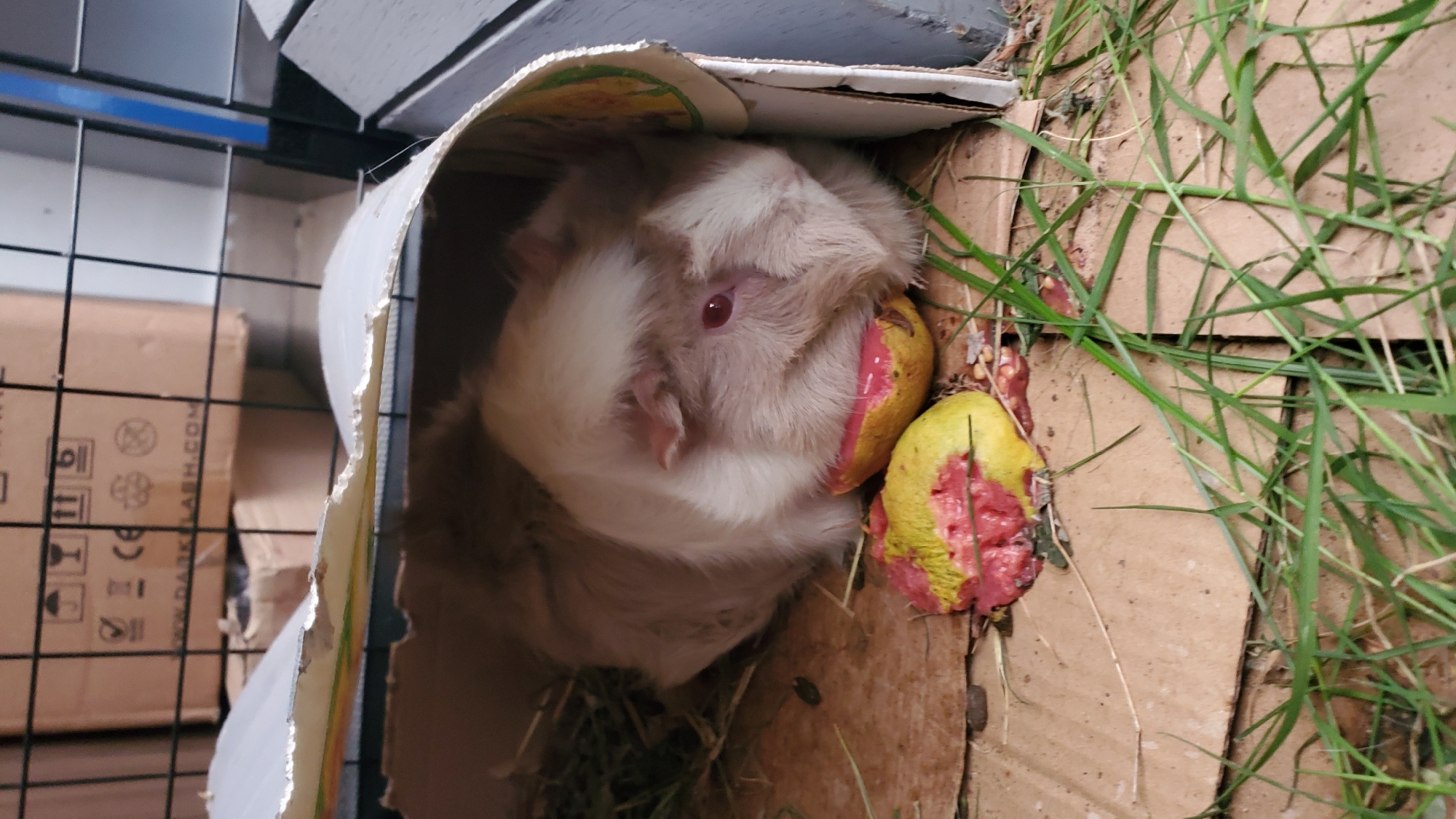 A light-colored guinea pig, predominantly white with tan markings and distinctive red eyes, is observed resting within a makeshift shelter constructed from a curved piece of cardboard. It is actively consuming a yellow-skinned fruit with visible pink interior flesh, consistent with a partially eaten guava, which rests on a cardboard surface. Fragments of fresh green grass are scattered around the animal and on the cardboard flooring. In the immediate background, elements of a wire cage structure are visible. Further back, additional brown cardboard boxes are stacked, one displaying identifiable shipping symbols and text including "www.DARKFLASH.COM" and "CE" markings. This scene is located in Curitiba, Brazil.